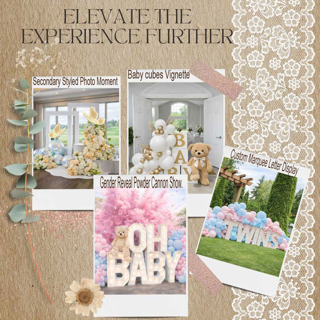Este nivel está diseñado cuidadosamente para aquellos que buscan una experiencia de decoración bellamente curada; desde una exhibición de entrada acogedora que marca el tono, hasta la instalación focal espectacular, una estación de pasteles y dulces completamente diseñada y viñetas complementarias de momentos fotográficos que completan la celebración con cohesión y encanto.
