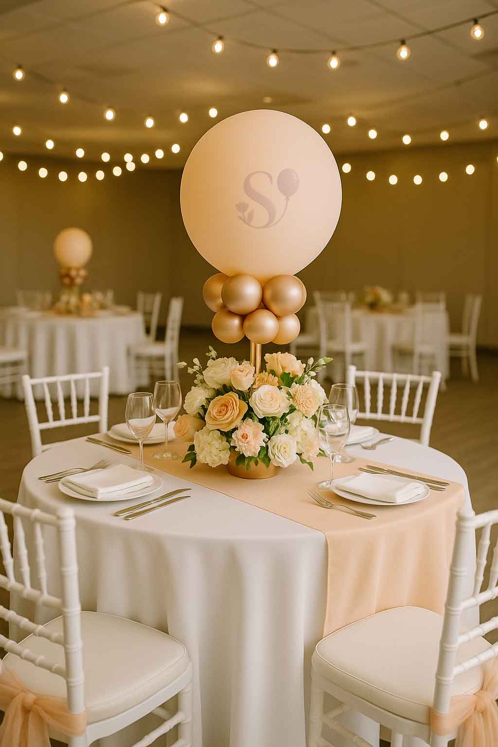 Bring elegance and charm to your event with our Balloon & Flower Centerpieces, a stunning blend of modern balloon décor and timeless fresh florals (Silk flowers are also available upon request). Featuring a large balloon topper accented with Chrome tones and a lush arrangement of fresh blooms, this centerpiece creates the perfect balance of whimsy and sophistication.