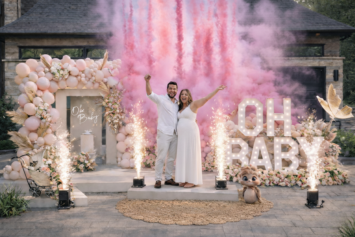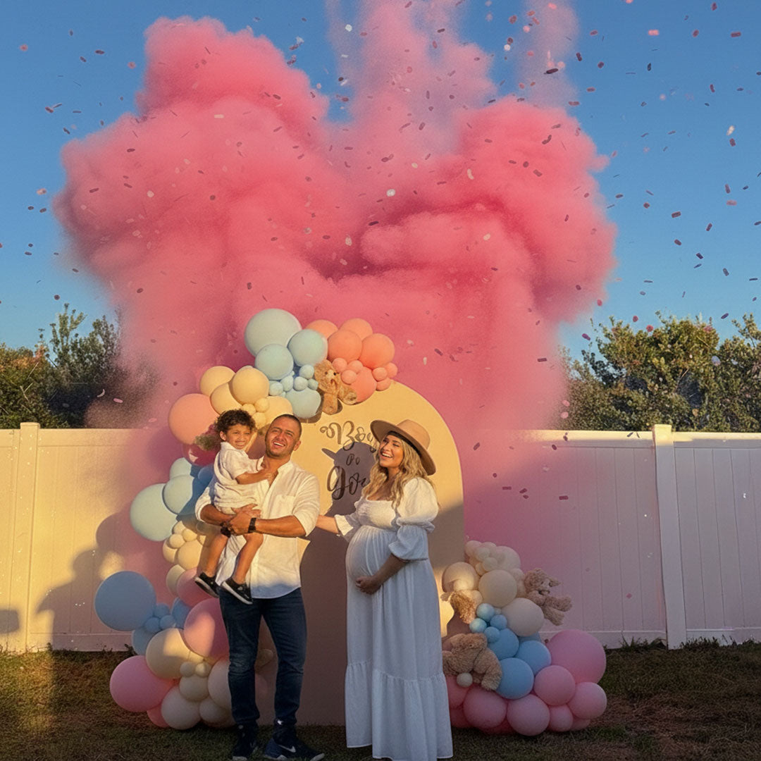 Una alegre explosión de color, cronometrada y coordinada profesionalmente para un momento de revelación fluido y listo para fotografiar.
