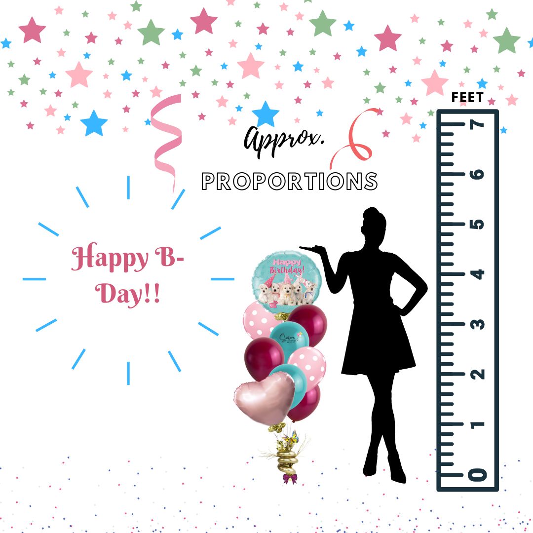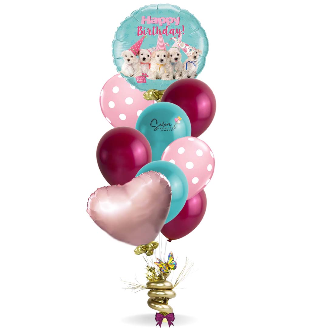 Ramo de globos de helio "Feliz cumpleaños". Incluye un globo con mensaje de feliz cumpleaños con juguetones cachorros con sombreros de fiesta y un conjunto de coloridos globos de helio, anclados a un peso decorado. Disponible en 2 estilos diferentes.