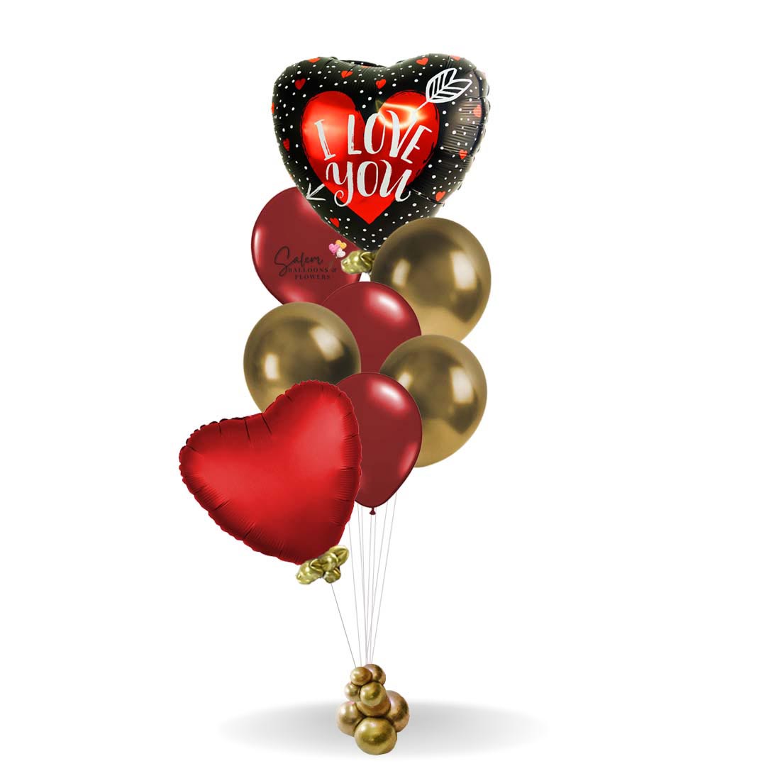 Ramo de globos "Love". Con un globo en forma de corazón con un mensaje "Te amo" y un conjunto de globos dorados y rojos, anclados a un peso decorado.