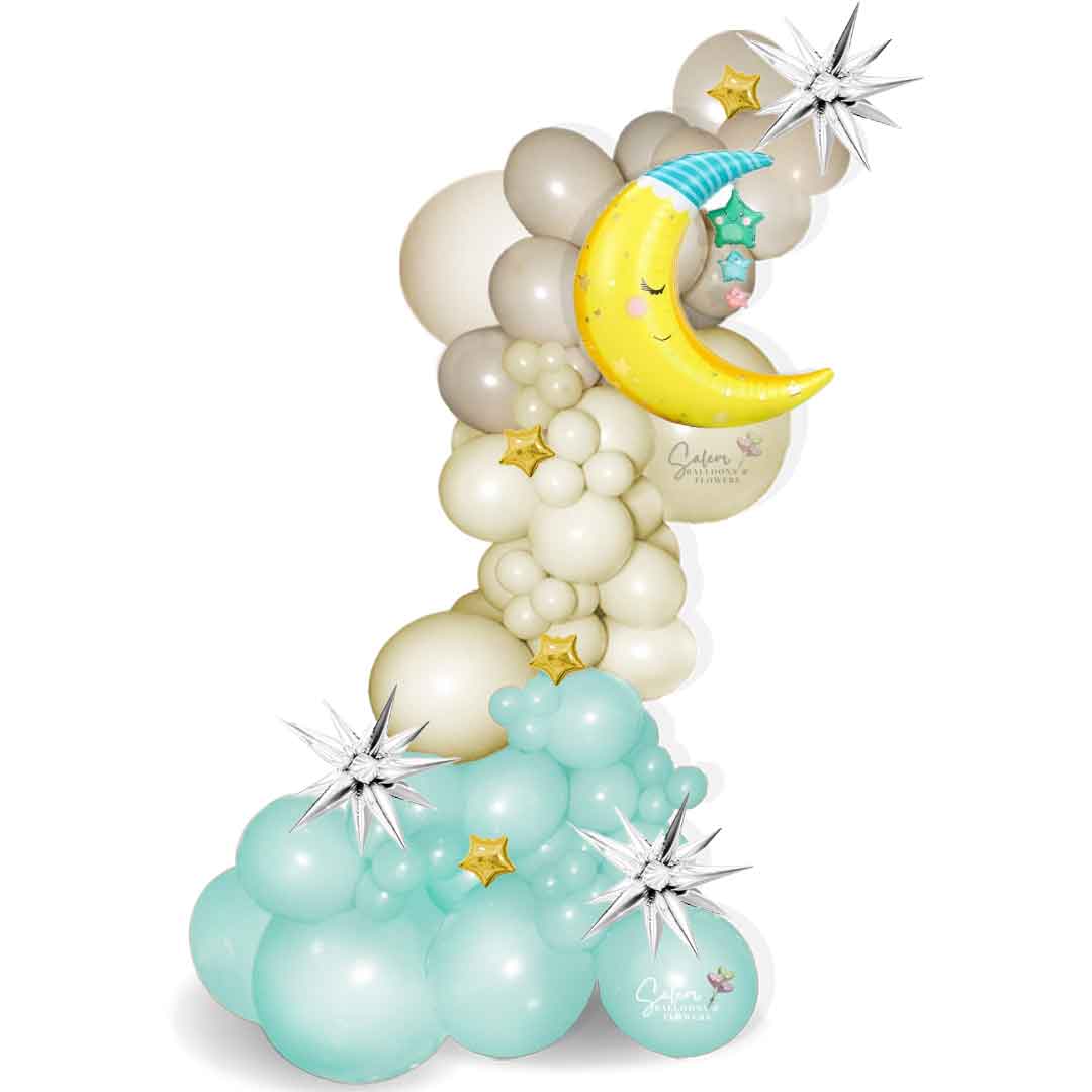 ¡Experimenta la elegancia y la belleza con nuestra decoración con globos LUNA EN PIJAMAS! Nuestro exquisito diseño presenta una encantadora luna recortada con un acogedor gorro de pijama mientras se adentra en el país de los sueños. Perfecto para baby showers o fiestas de revelación de género. Crea un momento inolvidable con nuestra decoración atemporal.