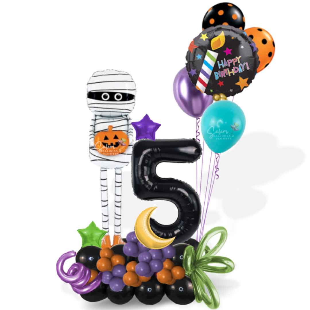 Celebra un cumpleaños espectacular con nuestra carpa de globos para cumpleaños de medianoche de mamá. Esta carpa con temática de Halloween incluye un globo de momia de 63" de alto, un número de globo grande, globos festivos rizados y un ramo de globos de helio con un globo que dice "Feliz cumpleaños". Con este ramo único y divertido, seguramente harás que la persona que cumple años se sienta especial. ¡Y si quieres pedirle dulces, siempre puedes agregar caramelos!