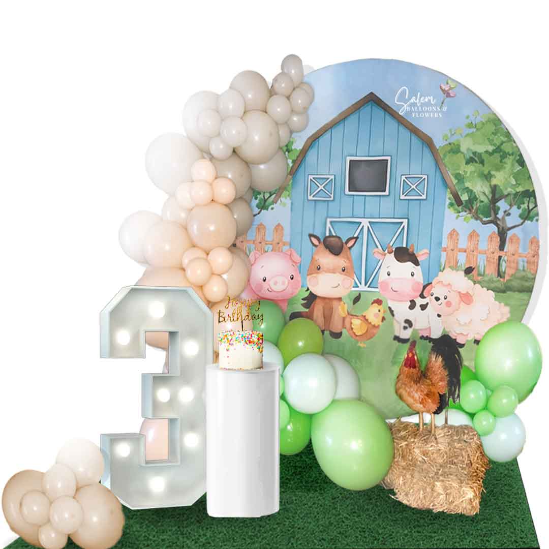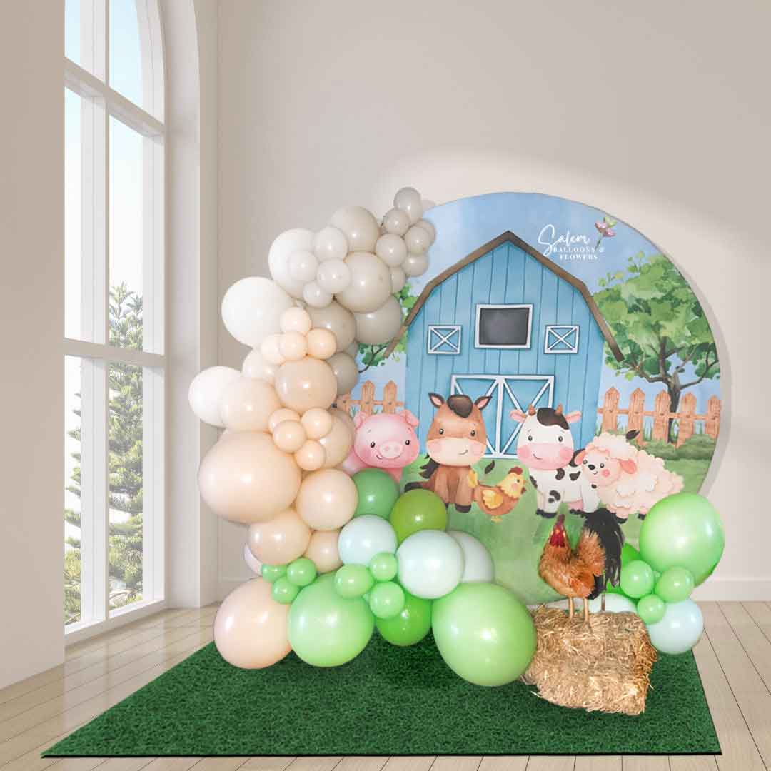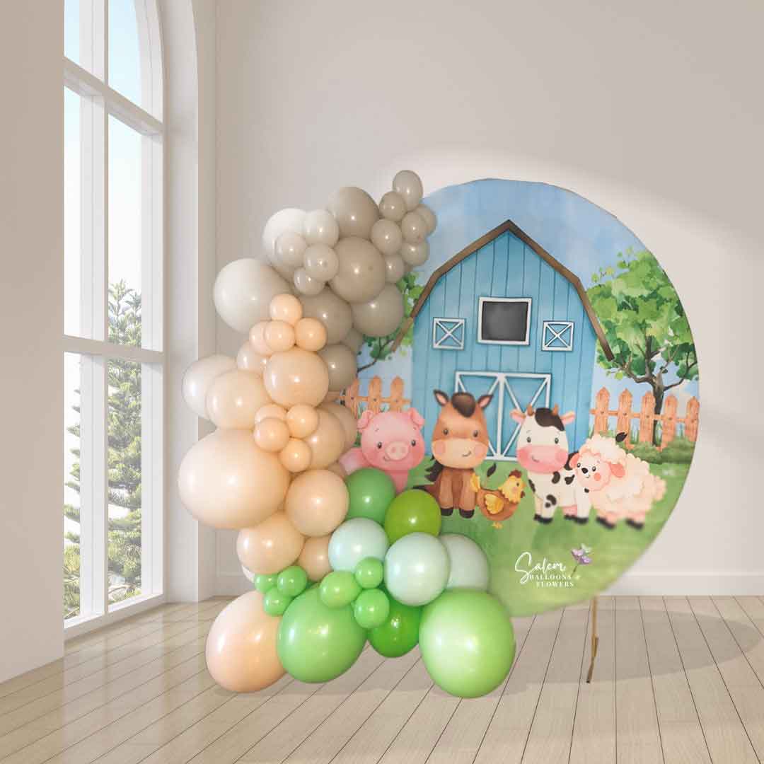 Bienvenido a la decoración con globos de 'My Little Farm': la manera perfecta de crear un ambiente elegante y exclusivo con temática de granja. Nuestra decoración con globos, elaborada con mucho lujo, viene en tres niveles de impacto, que van desde un impresionante fondo de aro dorado y una guirnalda de globos orgánicos hasta una guirnalda satélite adicional, fardos de heno, un gallo tierno y una marquesina iluminada. Sea cual sea la ocasión, transforme el lugar con nuestra decoración con globos única y sofisticada.