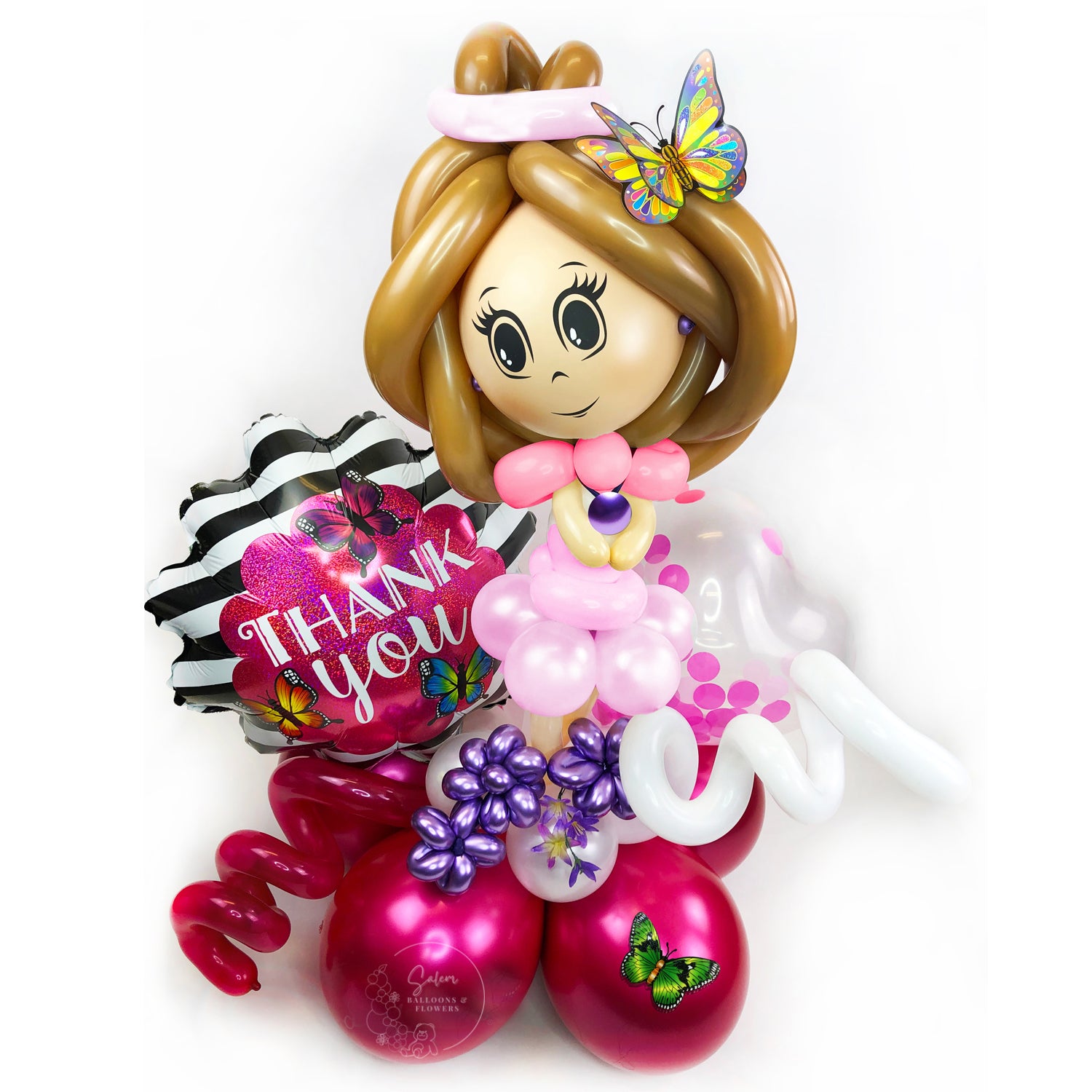 Gracias ramo de globos. Con una muñeca escultura de globo parada sobre un grupo de globos decorado. El estilo Deluxe viene con un juego adicional de globos de helio.