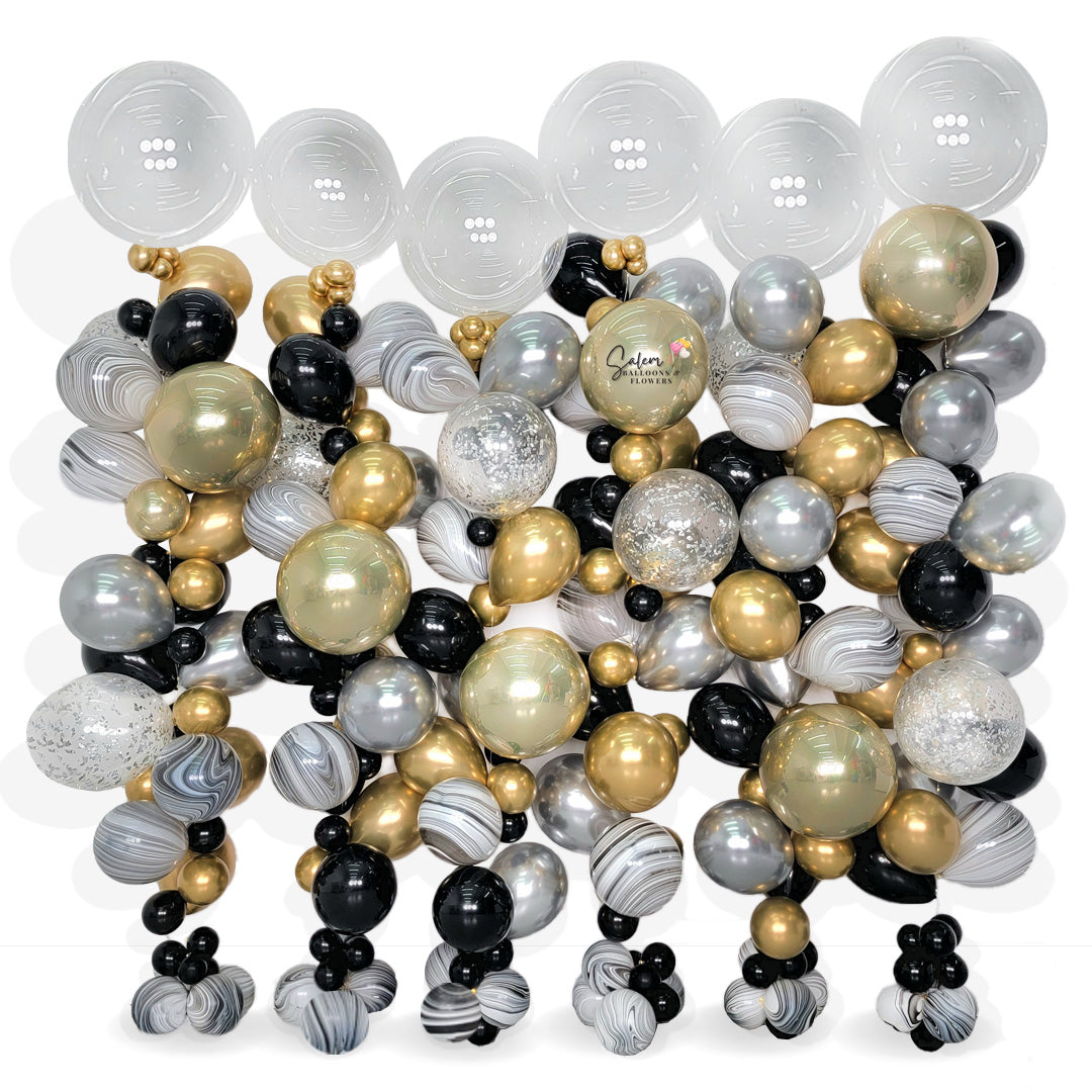 Our luxurious Balloon Fall is a chic addition to any occasion. With a sophisticated design featuring a crystal clear bubble balloon topper and a cascade of shimmering gold, silver, black, and marbled black and white balloons, our premium helium-filled Balloon Fall is a true showstopper. This versatile design allows for customization, giving you control over the density of the fall. From grand and opulent displays to subtle and delicate arrangements, our Balloon Fall elevates any backdrop or photo booth. Made with high-quality materials and expert craftsmanship, it's perfect for weddings, birthdays, anniversaries, graduations, corporate events, and more. Set up in minutes and enjoy the elegant touch of our Single Balloon Fall. Order now and let the magic begin!