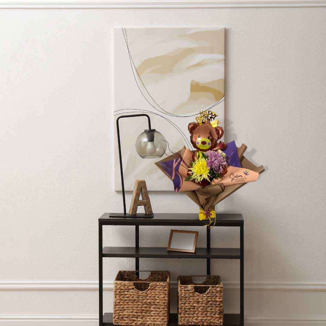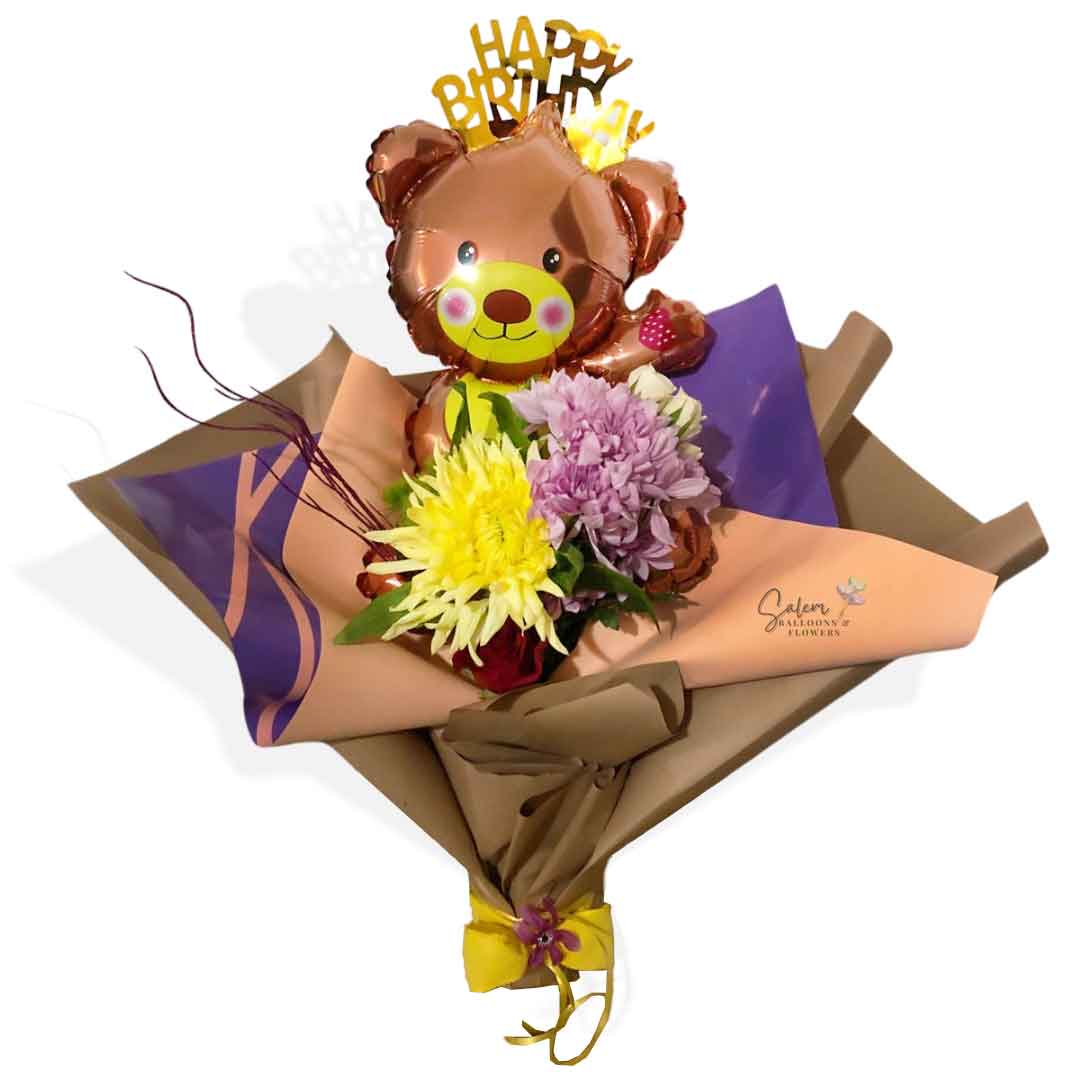 Say hello to our "Bear-y Sweet" Flower-Balloon Bouquet! This delightful bouquet comes with a whimsical bear balloon, carefully wrapped in colorful paper, and delivered to their doorsteps. Perfect for any occasion and guaranteed to put a smile on their face. It doesn't get sweeter than that!... okay, maybe with some chocolates it does! ☺