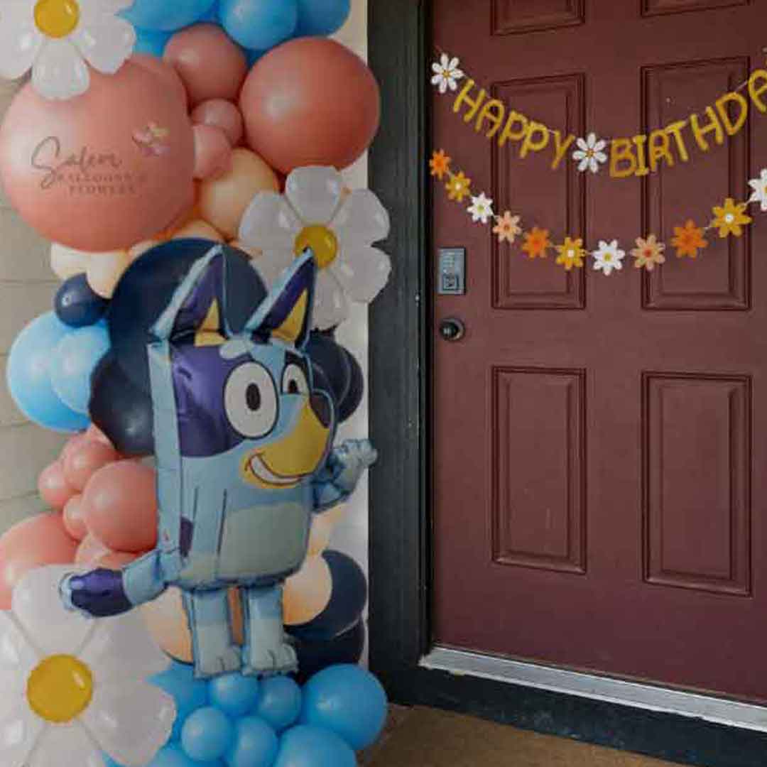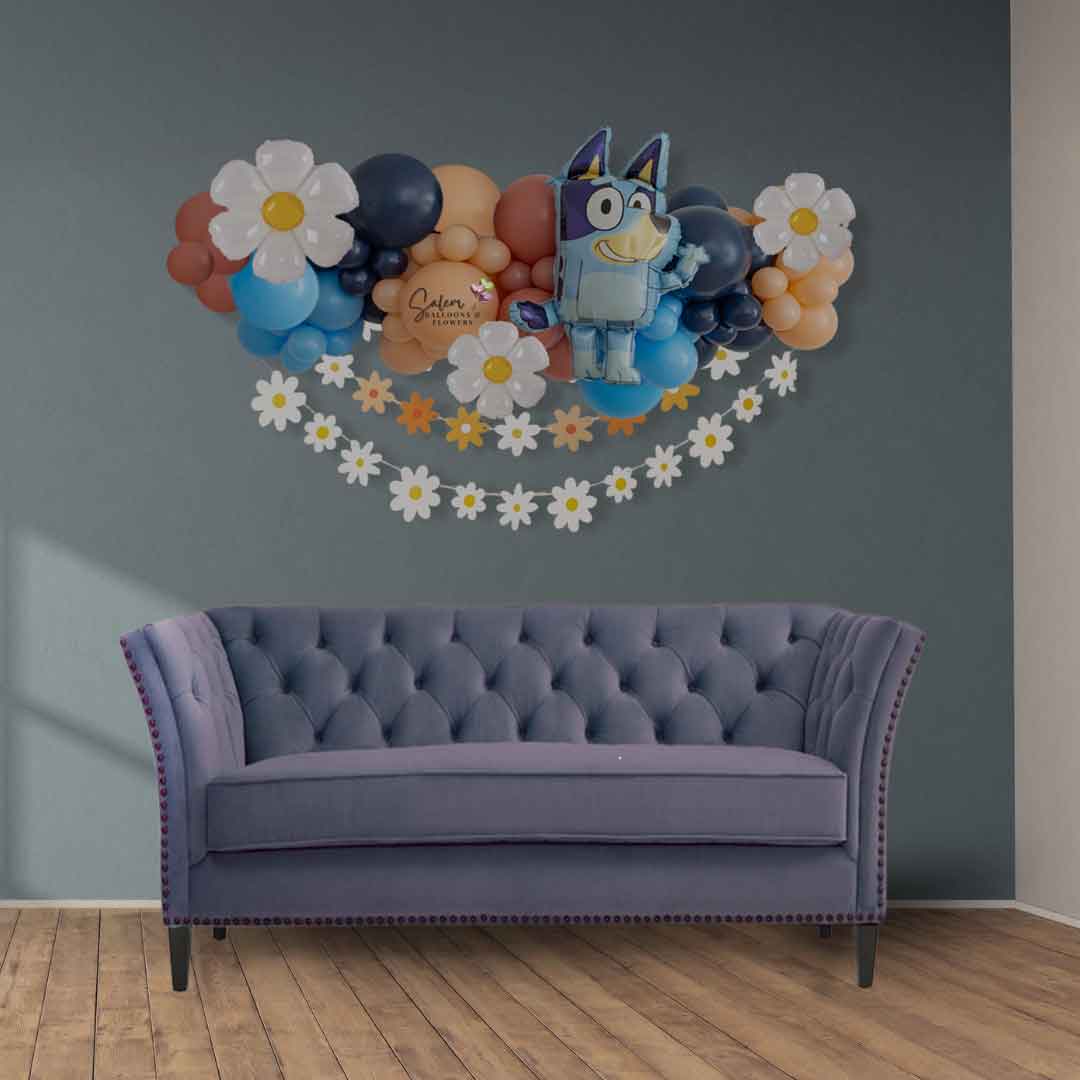 Celebrate your Bluey fan with this playful balloon garland featuring the beloved character surrounded by cheerful daisy flower balloons. Perfect for parties or special occasions, it adds a fun and vibrant touch that will delight kids and adults alike. Brighten any room with this charming Bluey balloon décor!