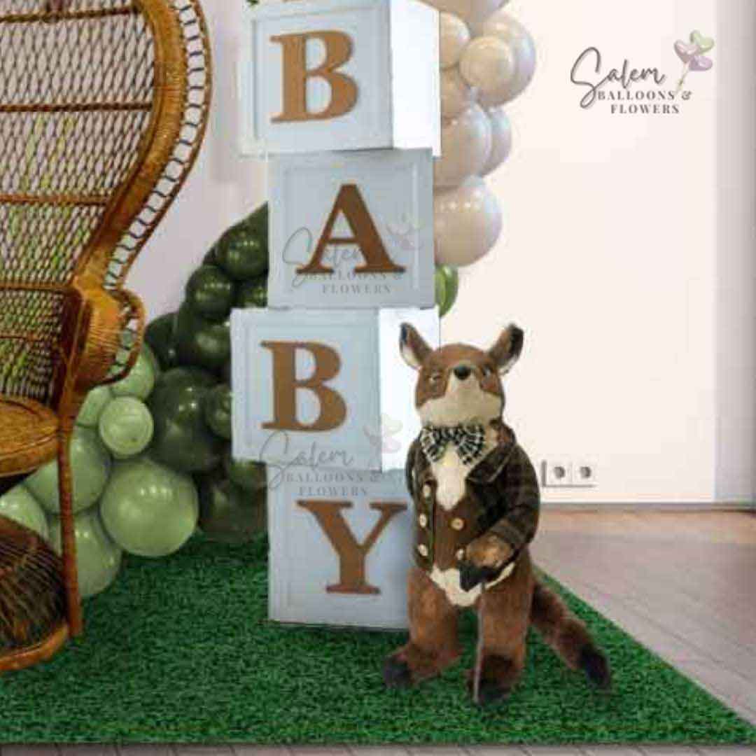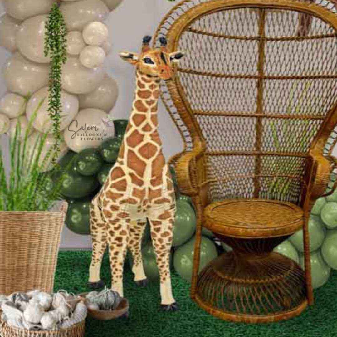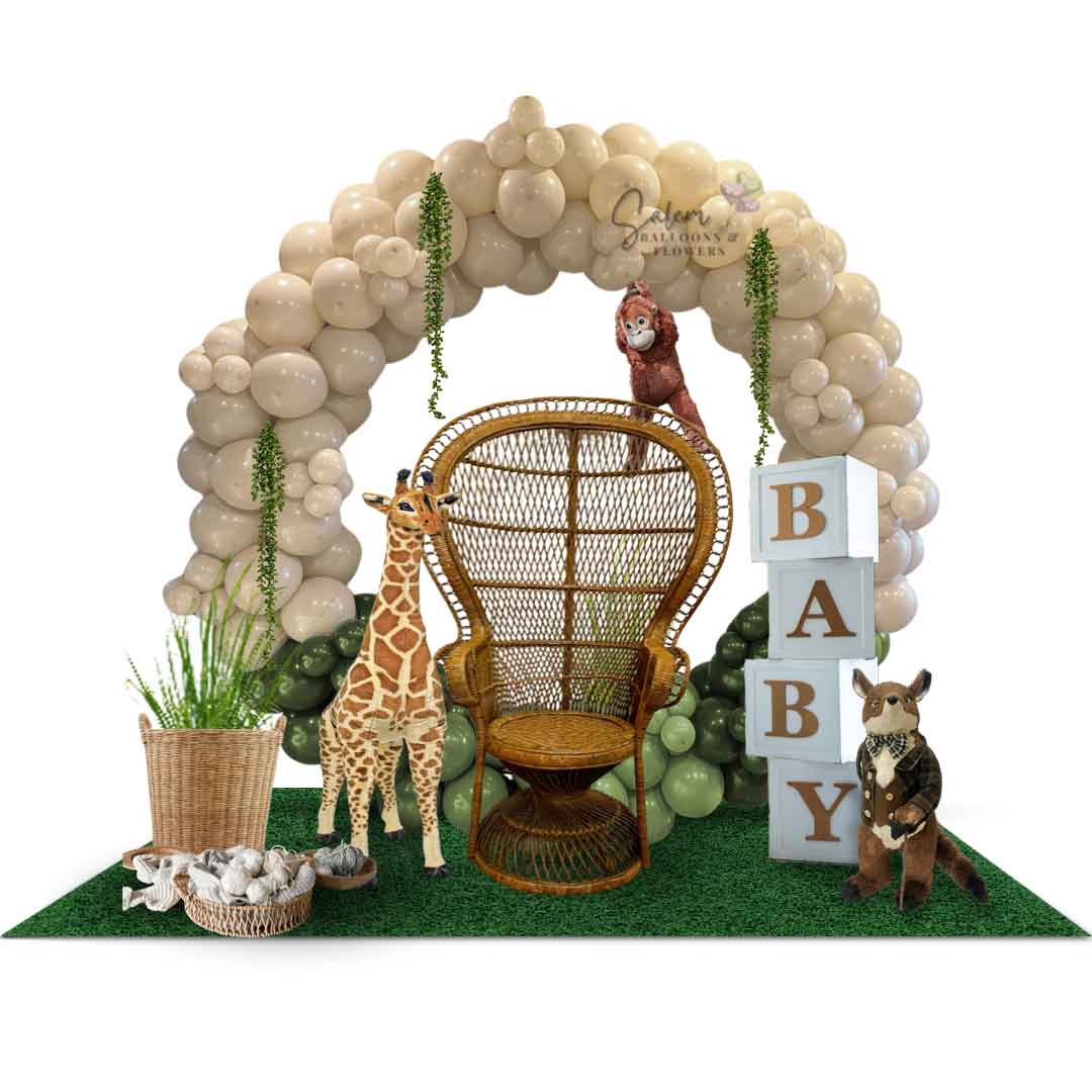 Create the ultimate jungle atmosphere with our Boho Jungle Babe Balloon Décor! Perfect for baby showers or 1st birthdays, this package features a 7'x7' Balloon Hoop adorned with adorable jungle animal props, grass floor treatment, BABY cubes, and a stunning peacock chair. Get ready to party like a wild child!