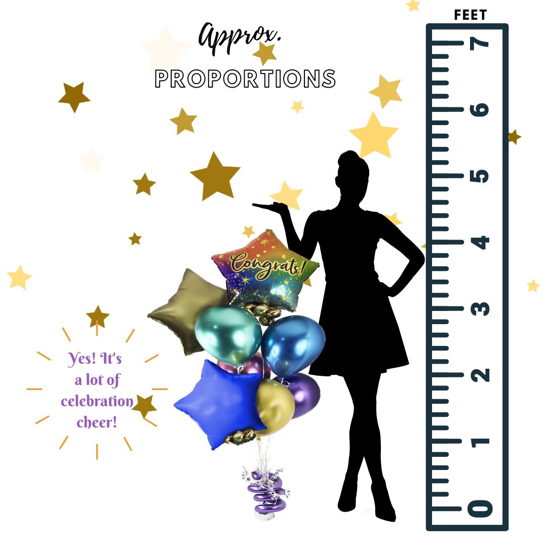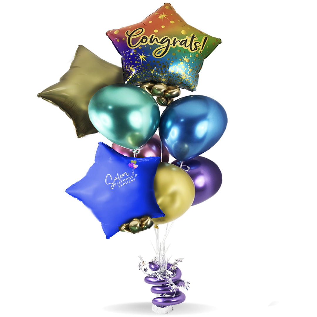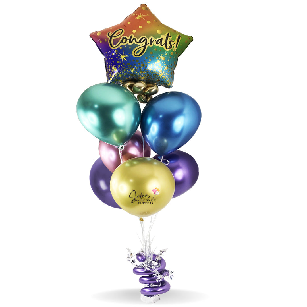 Congrats balloon bouquet. Featuring a Star shaped Mylar balloon with a Congrats! message and a set of bright colored helium balloons, anchored to a decorated weight.