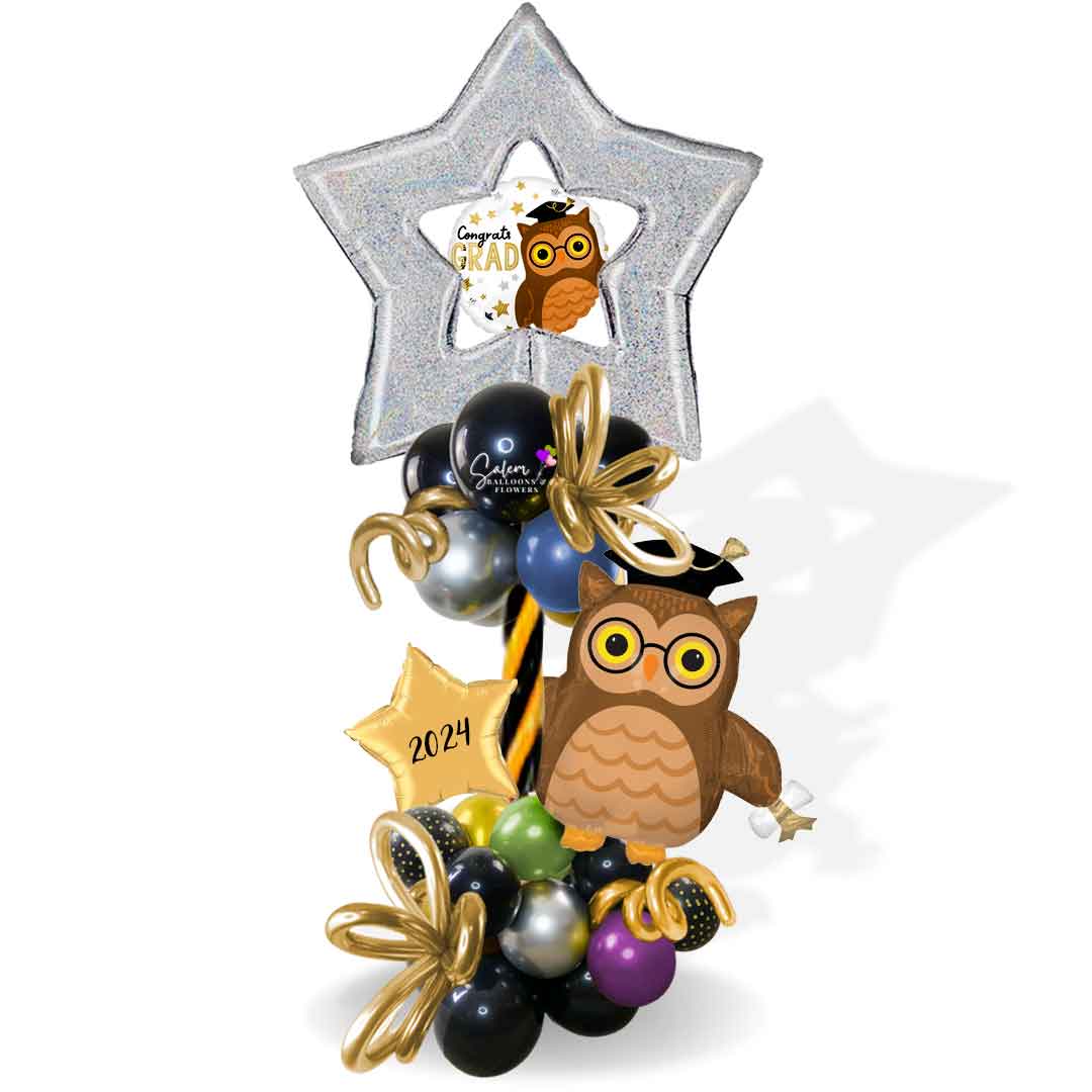 Congrats Grad! Extra tall Balloon Column. Featuring an extra-large Wise Owl Mylar balloon  and an extra large silver open star with an Owl Congrats Grad message. An amazing gift, that also doubles as a prop to take memorable pictures.  You can personalize your bouquet with their name.