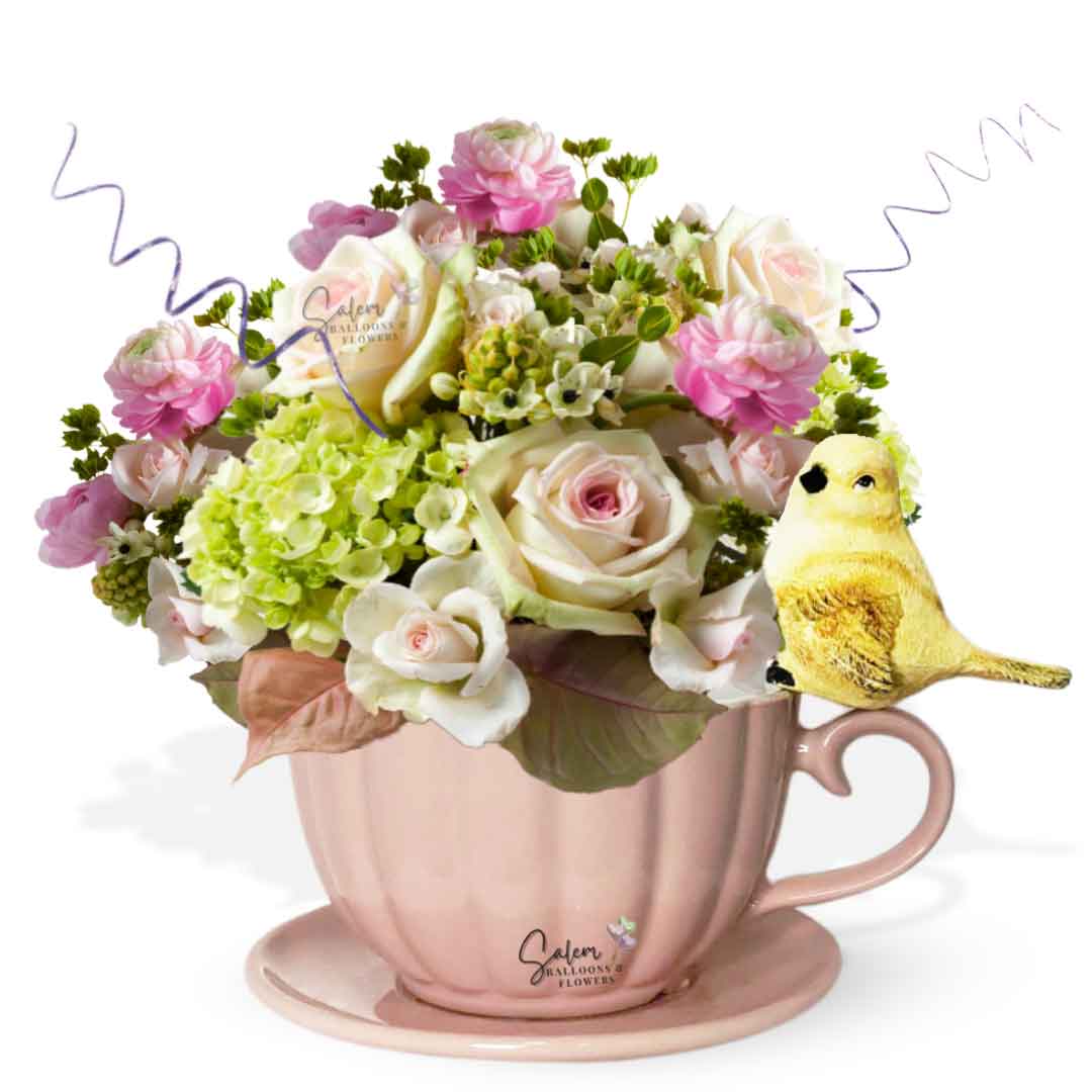 Indulge in delightful charm with our 'Cup of Chirps' flower arrangement. Fresh blooms are nestled in a pink cup vase, featuring a whimsical bird for a touch of playfulness. Perfect for any occasion, from Birthdays and Get-Well wishes to Mother's Day, this arrangement effortlessly delivers joy and elegance.