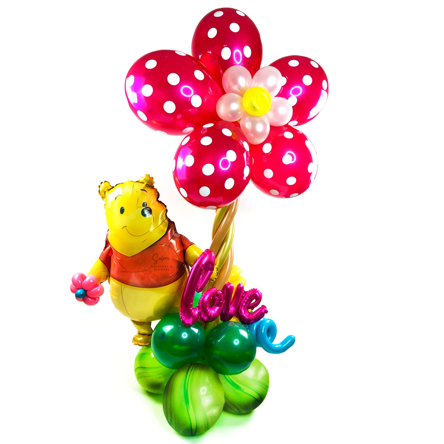 Daisy and Pooh Balloon Column, featuring a large Pooh character balloon standing on a daisy flower balloon.