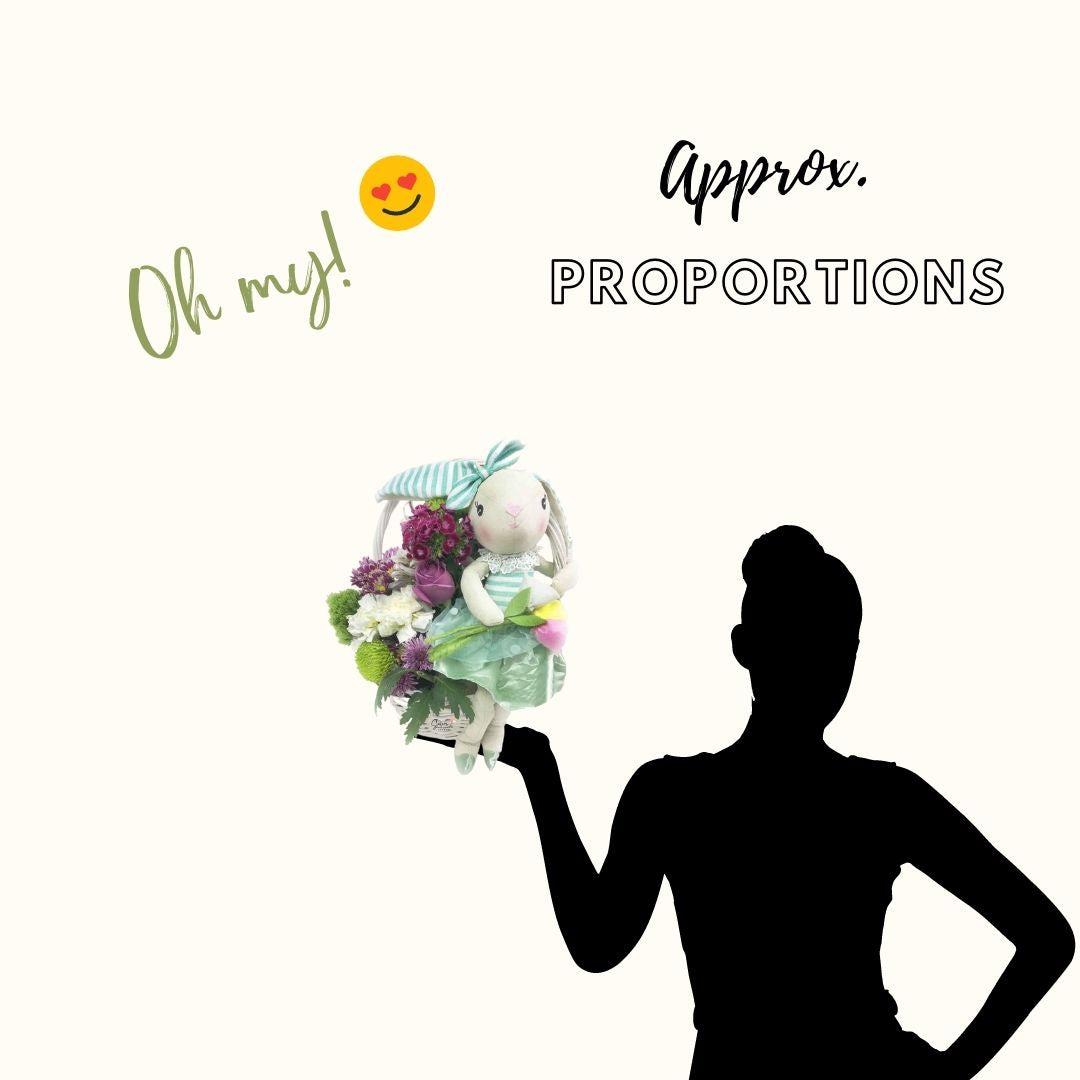 Breezy and delicate flower basket. Filled with fresh flowers and a lovely bunny wearing a mint green dress. So adorable!