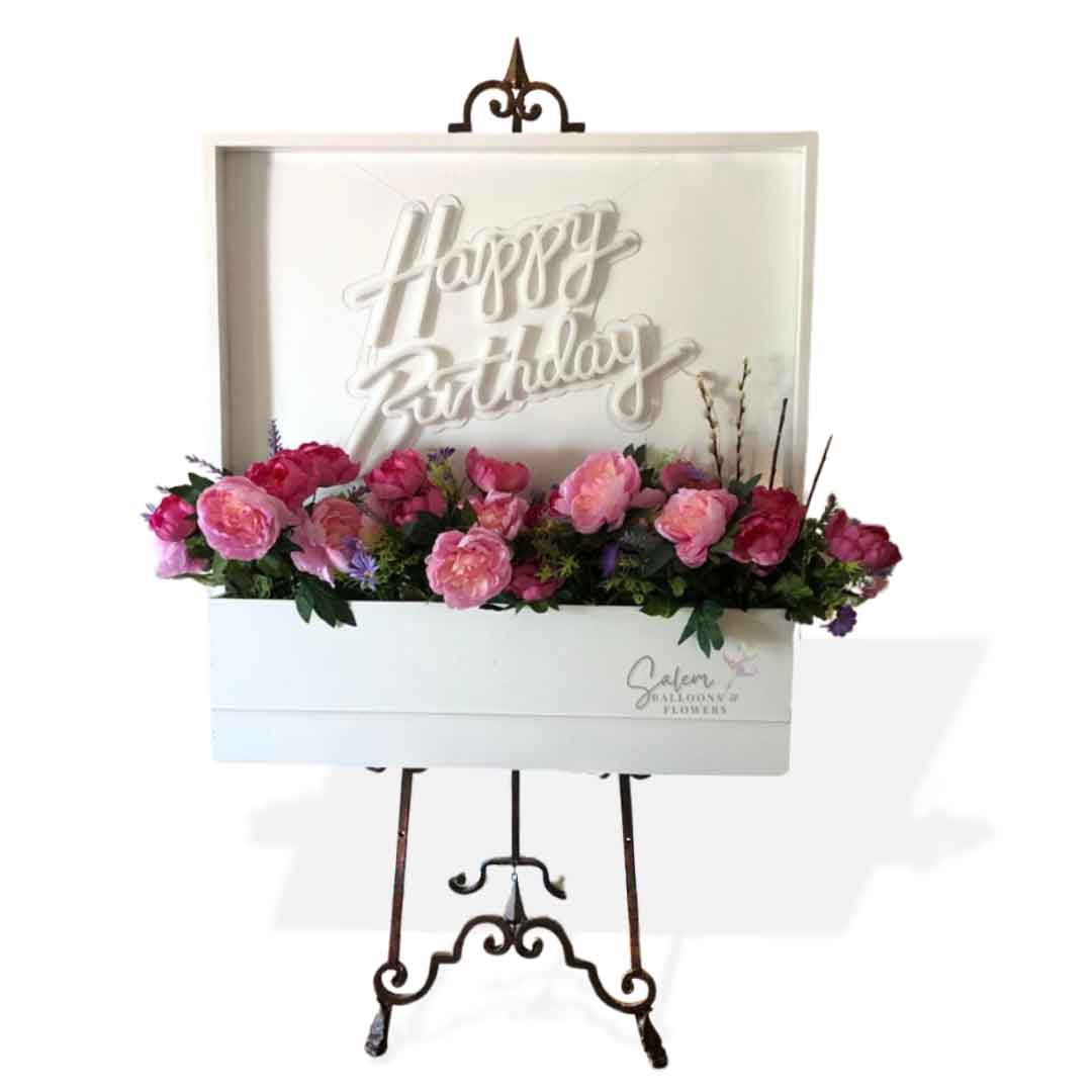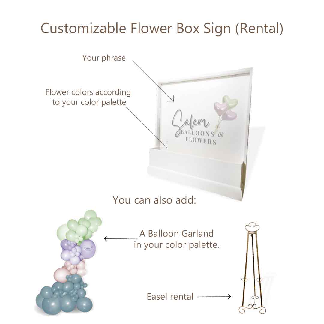 Welcome your guests in style with our Flower Box Welcome Sign. Set the tone and elevate expectations for your event with this elegant sign. Display it on the floor or elevate it on an easel for a high visual impact. Choose custom flower colors to match your palette and get ready to impress!