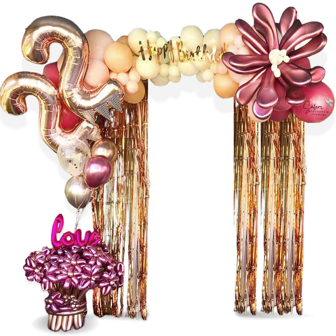 Capture their attention with our Front Porch Surprise Balloon Decor. The perfect way to add a touch of magic to any celebration. Featuring stunning flower balloon sculptures, a Happy Birthday sign, and shiny tinsel curtains, topped off with balloon numbers, this decoration will dazzle and amaze. Elevate your party with this luxurious and exclusive decoration.