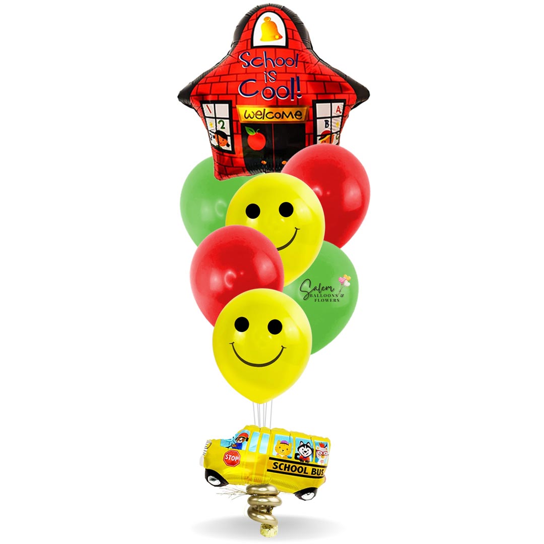 Back to school balloon bouquet, featuring a star Mylar balloon with a "School is Cool" message and a set of colorful helium balloons anchored to a decorated weight with a yellow school bus balloon.