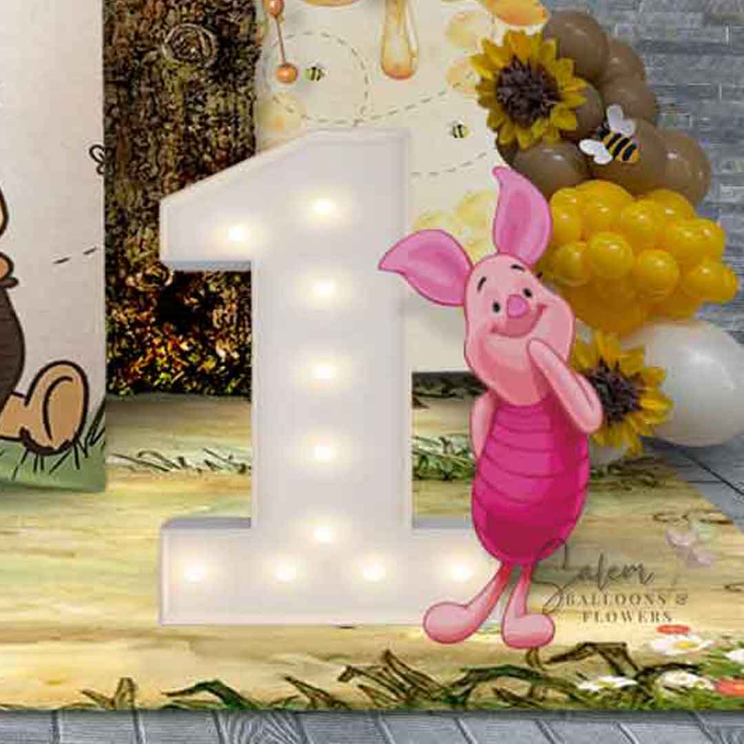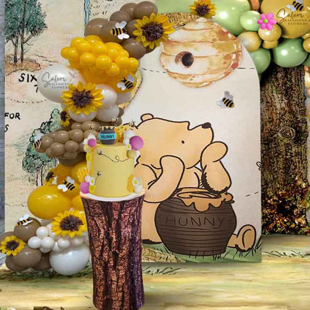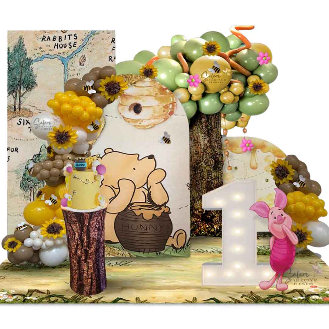 Celebrate with our "Sweet as Hunny" balloon décor, inspired by the Hundred Acre Wood. This bright setup features honey-gold balloons, sunflowers, bees, and Pooh’s “hunny pot,” plus a light-up number and cute Piglet cutout. Perfect for baby showers and first birthdays.