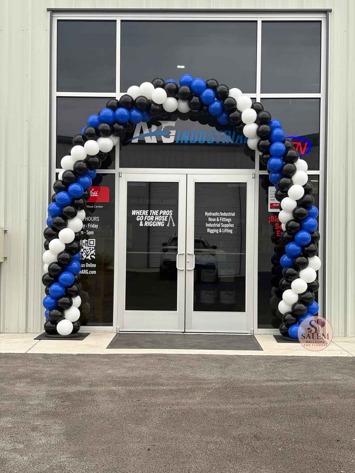 Traditional balloon arch. This elegant and sophisticated balloon arch is perfect for a grand entry. Approx 14 Ft wide by 10 Ft tall, this majestic piece combines up to four colors in a unique spiral effect, making it a stunning addition to your event. Elevate the atmosphere with this timeless and timelessly exquisite traditional balloon arch.