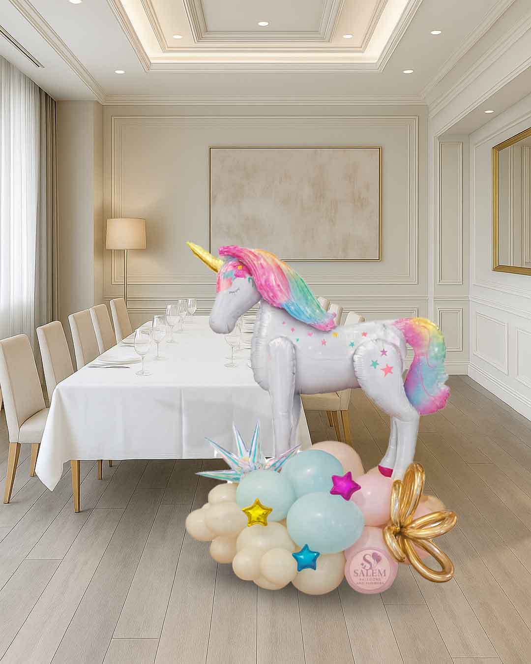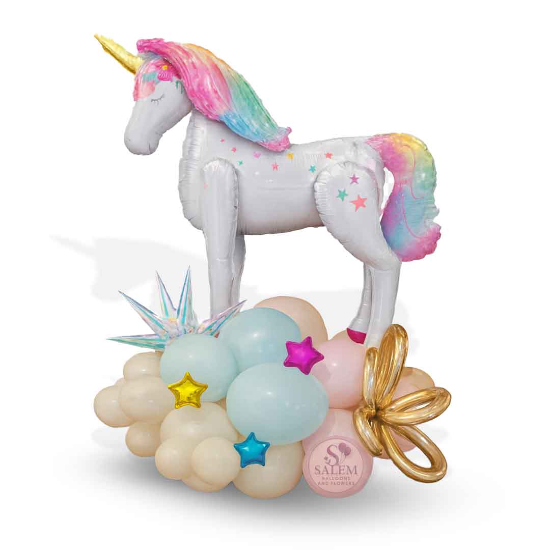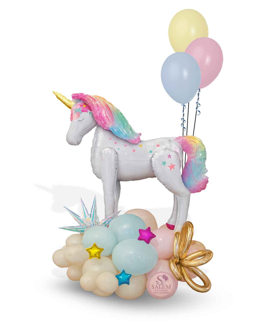 Bring a touch of pure magic to any celebration with our Unicorn Dreams Balloon Bouquet. Standing nearly six feet tall, this whimsical arrangement features a majestic pastel unicorn surrounded by a soft cloud of pearly balloons and metallic stars.