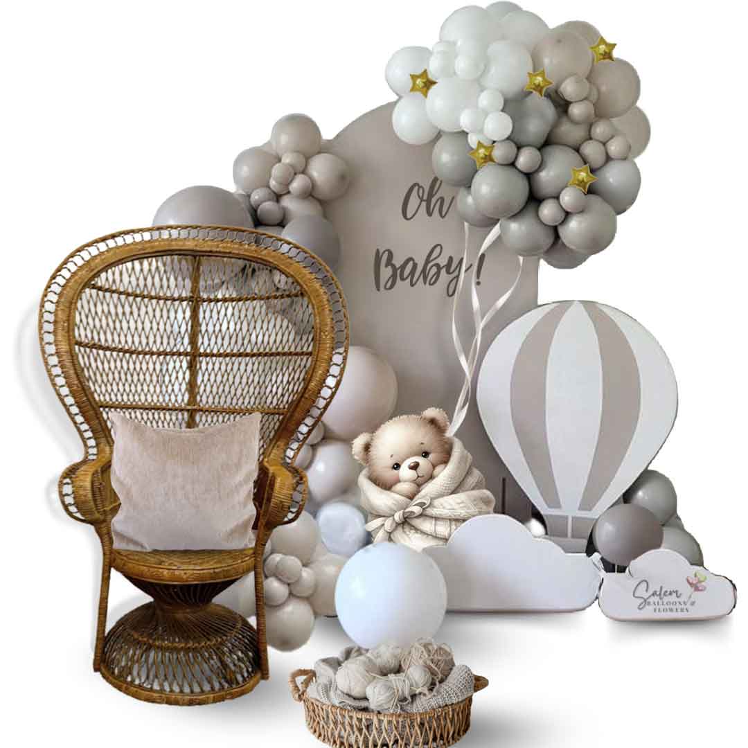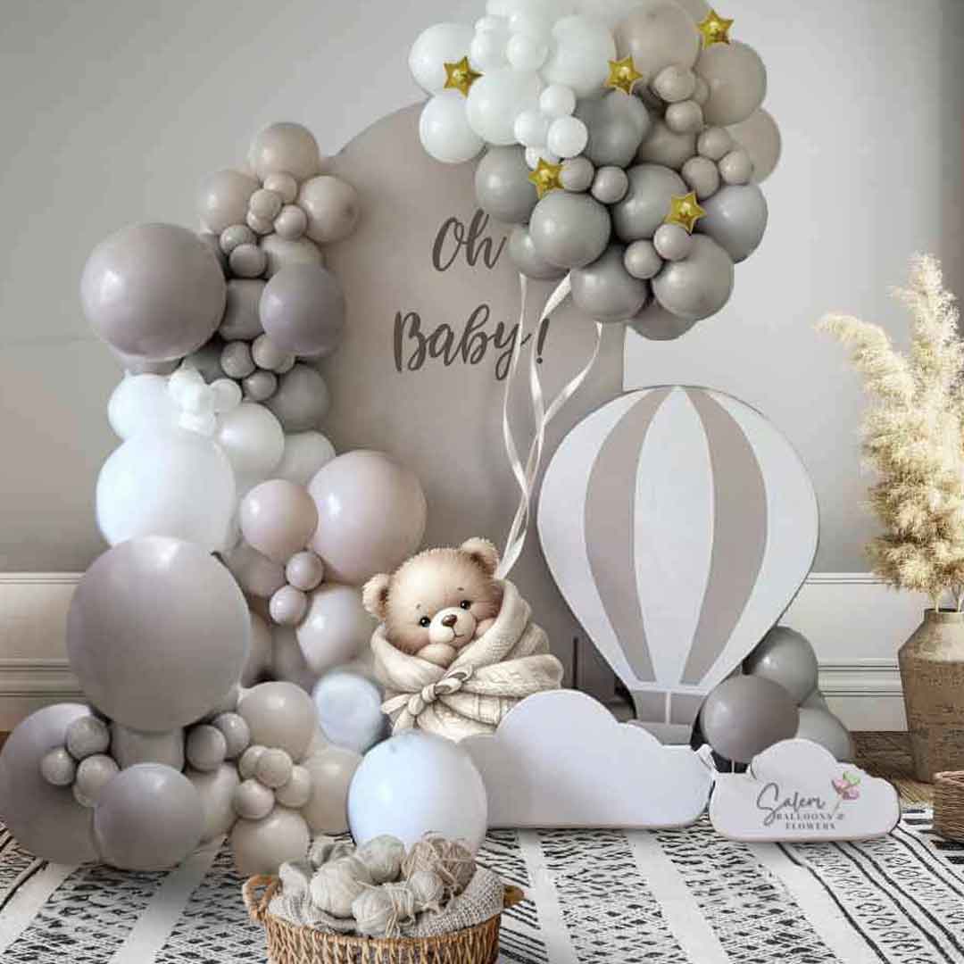 Because every baby deserves a sky full of love, float into the sweetest celebration with our Up Up and Snuggles Balloon Décor. Featuring a dreamy mix of soft beige, gray, and white balloons, this neutral-toned setup is perfect for welcoming a baby boy, girl, or keeping it delightfully gender-neutral. This display features cute cutouts of a cozy teddy bear wrapped ,in a blanket and a whimsical hot air balloon, set the scene for heartwarming memories and picture-perfect moments. Ideal for baby showers, welcome baby parties, or first birthdays.